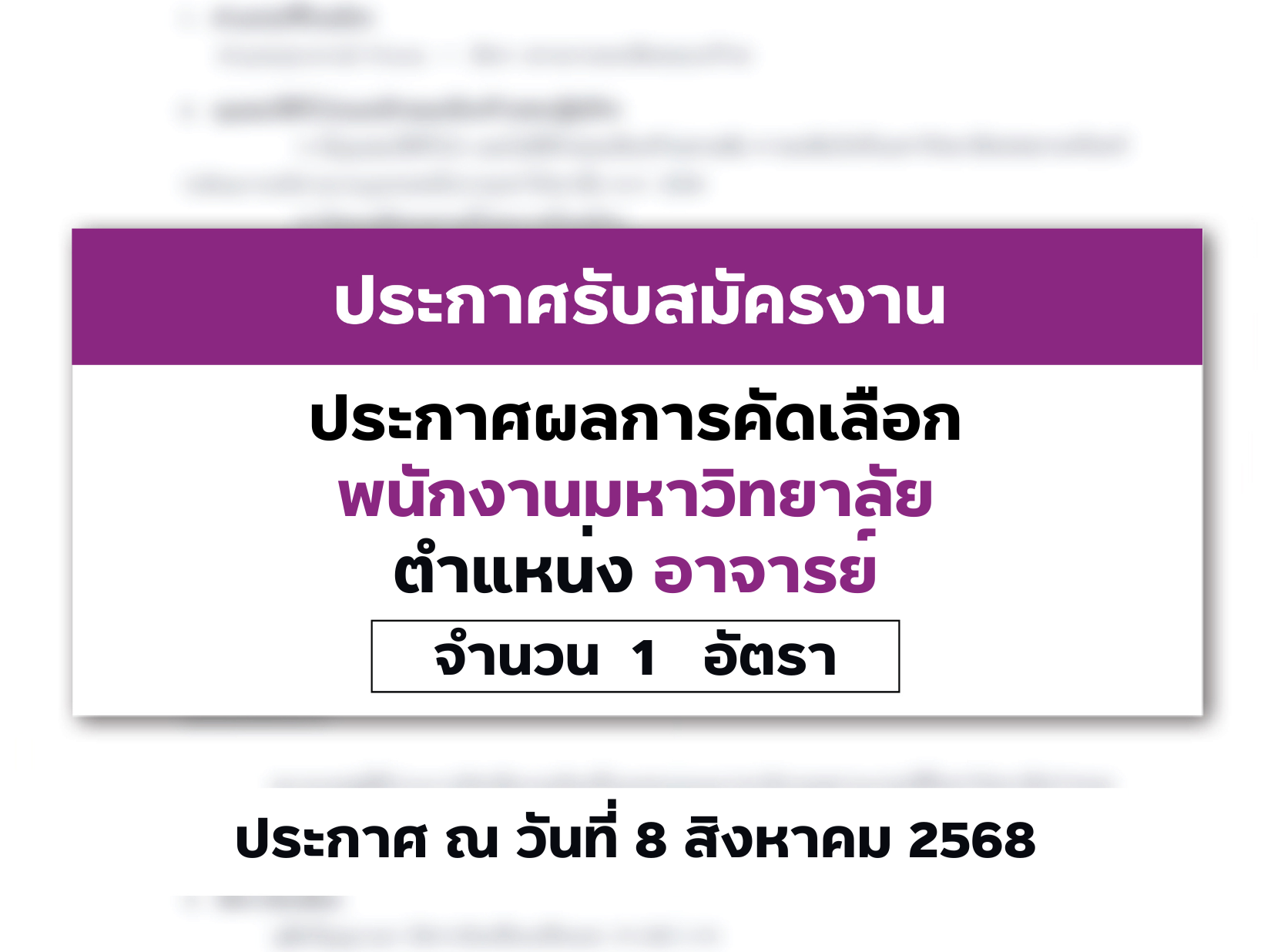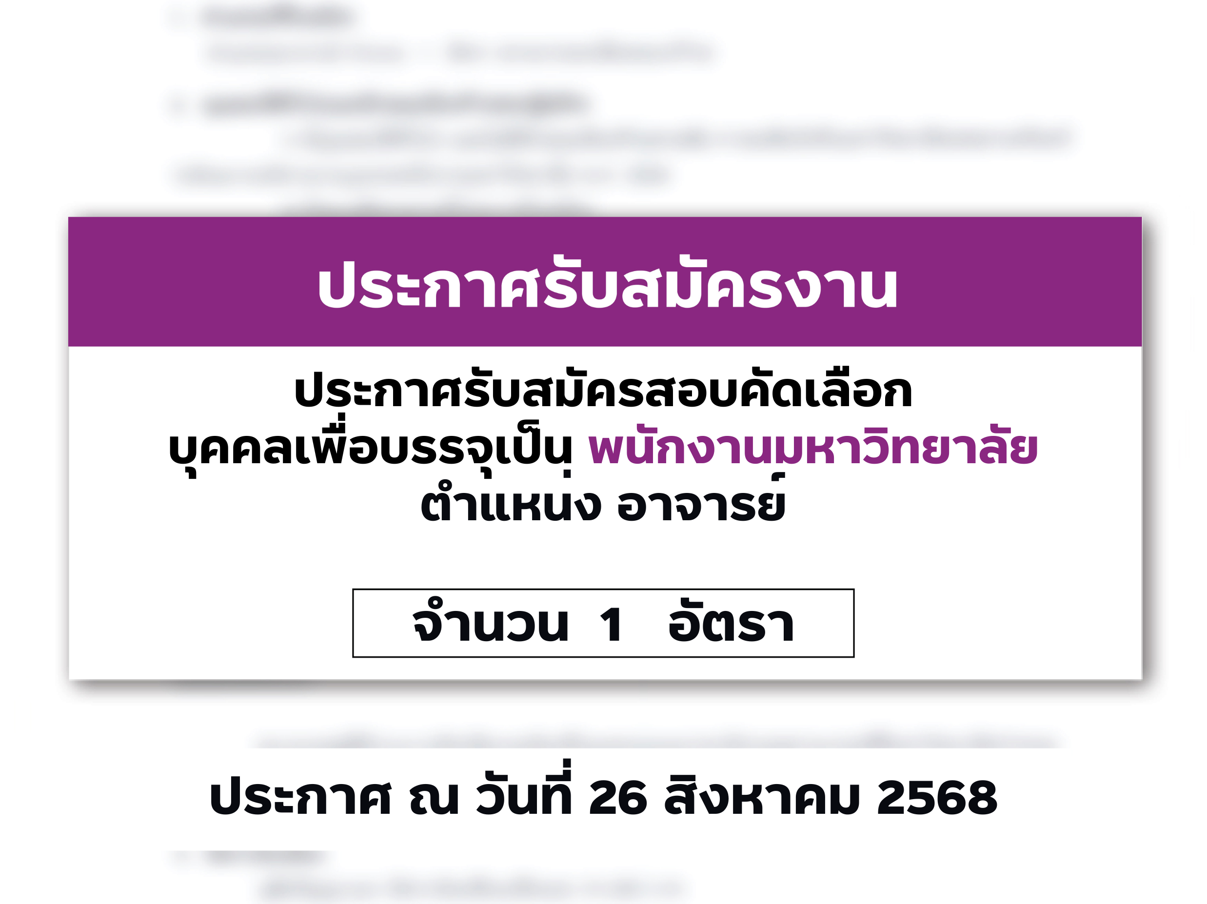 ไม่มีหมวดหมู่ 28/08/2025 ประกาศรับสมัครคัดเลือกบุคคลเพื่อบรรจุเป็น พนักงานมหาวิทยาลัยตำแหน่งอาจารย์ จำนวน 1 อัตรา